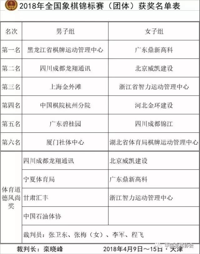 4月9日至15日,2018年全国象棋锦标赛(团体)在天津滨海新区上演七天大战。比赛男子组27支队伍、执行9轮积分制,女子17队七轮积分。