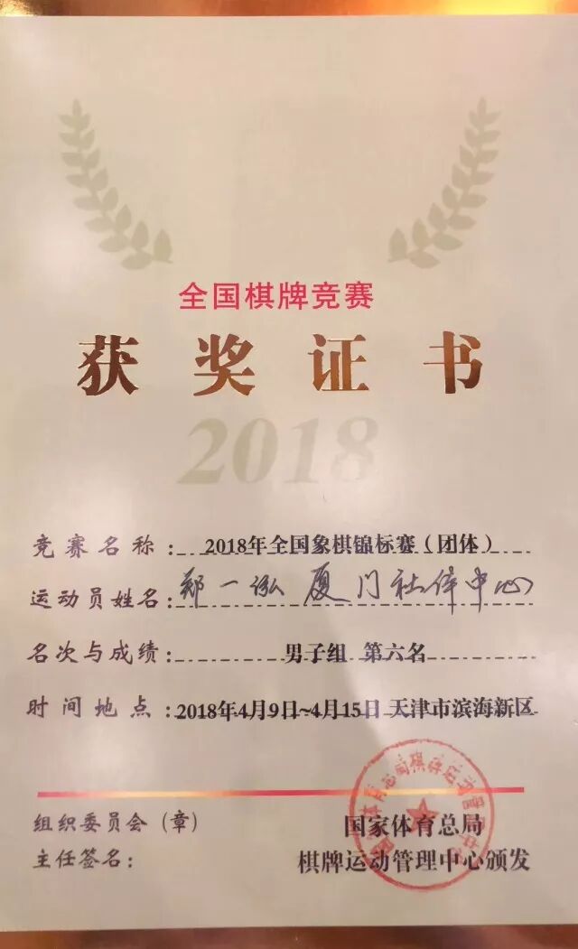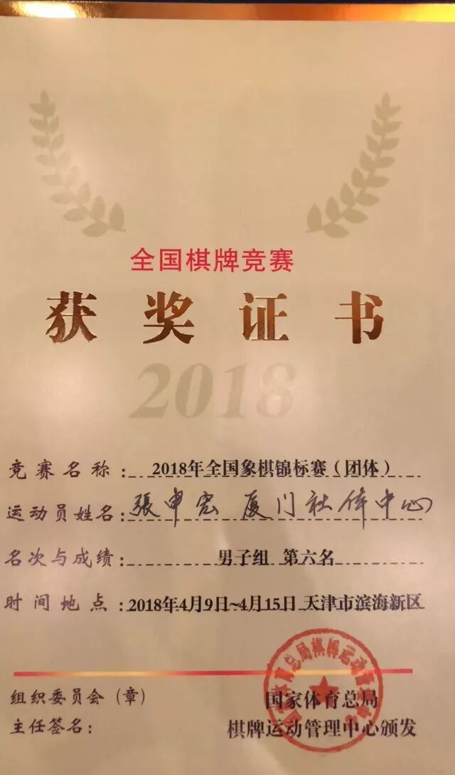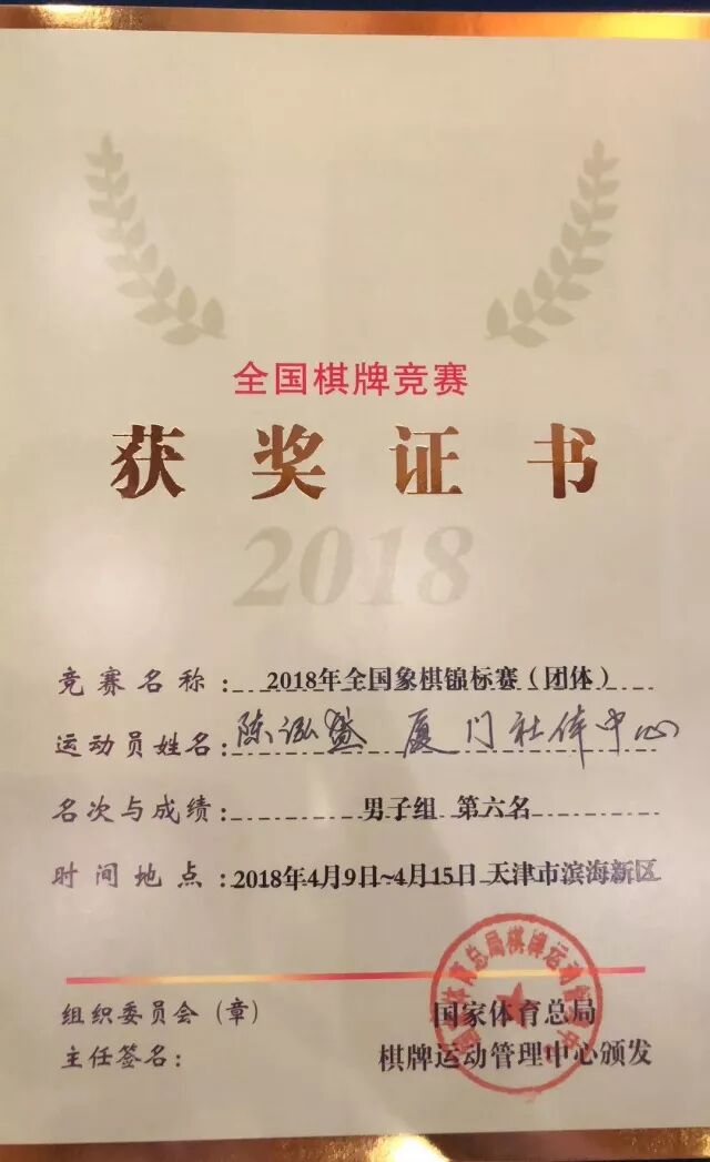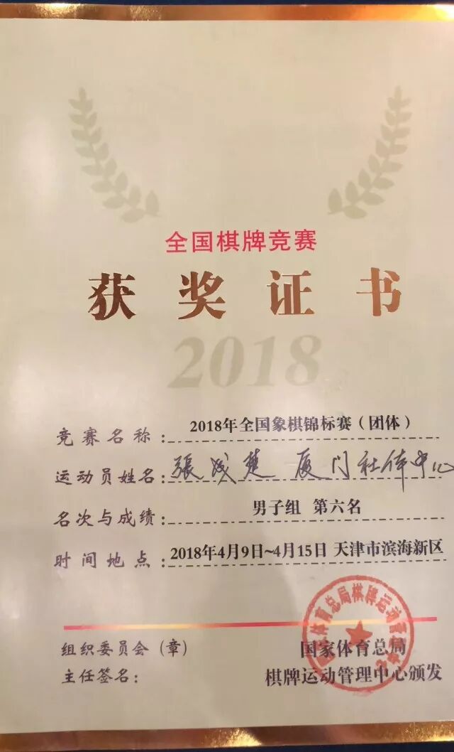 获得晋升男子新大师资格厦门队队员张成楚为厦和棋院特大班学员。